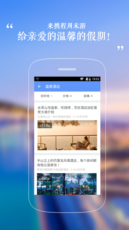 携程周末游,帮你解决周末出游度假的选择题。只推荐精选商品与玩法,不再眼花缭乱无从选择。1、周末去哪儿?发现新鲜的出游玩法,高品质的度假酒店。