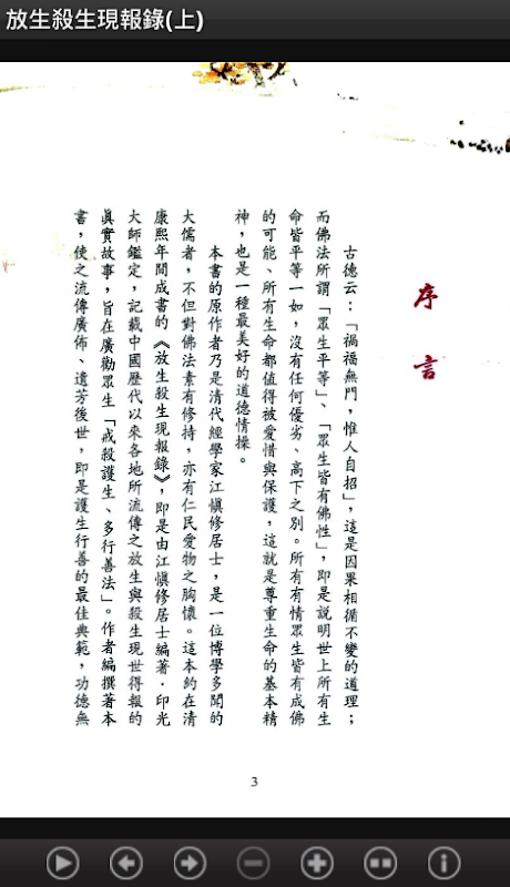 由於原文乃以文言文撰寫,行文晦澀難懂,故將原文重新白話潤飾並配合插圖。潤飾後的故事沒有艱深的論述,可讀性強,符合現代人的閱讀習慣。其中放生故事,有不少使人溫馨感動,例如:救蟻延年的小沙彌、憐龜卻病的黃叔達、鳥伸冤獄的陸善人等,都具有相當值得學習的護生精神;而殺生故事則警惕世人,例如:嗜肉成豬的南京舉人、膿瘡療饑的杜章、射鹿中子的吳唐等,他們好肉殺生所得的惡果,值得大家引以為鑑。