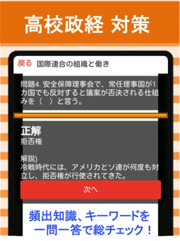 高校 公民「政経」に関する大量の知識をアプリで克服!授業の復習用からセンター試験まで、合格に必要な知識問題を厳選!知識の総チェック&弱点克服に最適です!
