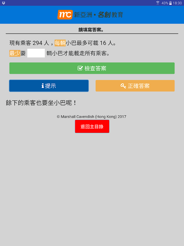學生作答完畢,可選擇「檢查答案」,看看自己的答案是否完全正確。如是正確,稍後便會自動出現另一題應用題;如是不正確,學生可再次作答直至正確為止,或者選擇「正確答案」來觀看正確答案。