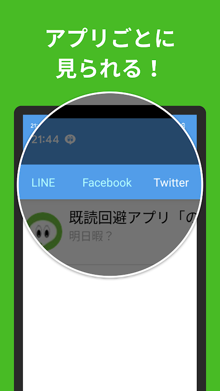 Một ứng dụng có thể được đọc mà không cần thêm phần đã đọc (kidoku). Ngoài tin nhắn, bạn cũng có thể xem ảnh và tem, hiện tương thích với LINE, Facebook và Twitter! Dành cho bạn nào chán đọc!