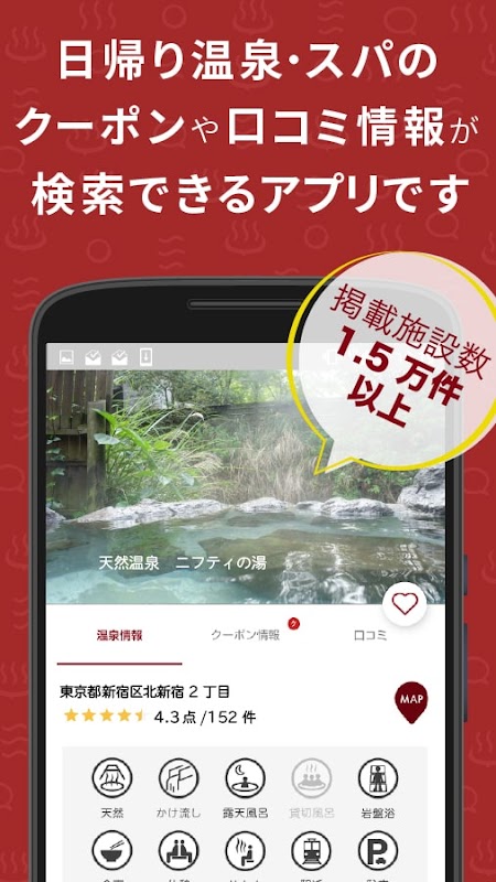 Đây là một ứng dụng miễn phí cho phép bạn tìm kiếm thông tin chi tiết về cơ sở vật chất như suối nước nóng một ngày, spa và phòng tắm siêu công cộng, phiếu giảm giá và thông tin truyền miệng. Bạn có thể tìm thấy cơ sở tắm nước nóng yêu thích của mình bằng cách tìm kiếm trên bản đồ hoặc tìm kiếm trên bản đồ.