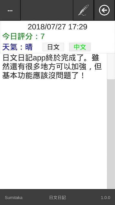這個App與一般日記不同的地方在於,每篇日記,除了中文,還有日文的分頁。