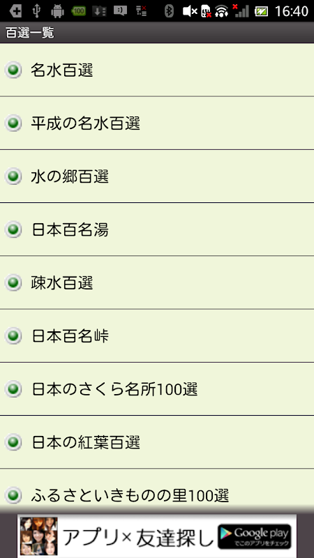 Đây là một ứng dụng thu thập dữ liệu vị trí của tổng số 4.000 địa điểm, bao gồm 40 loại trong số 100 địa điểm nổi tiếng, danh lam thắng cảnh và di tích lịch sử ở Nhật Bản và hiển thị chúng trên bản đồ.