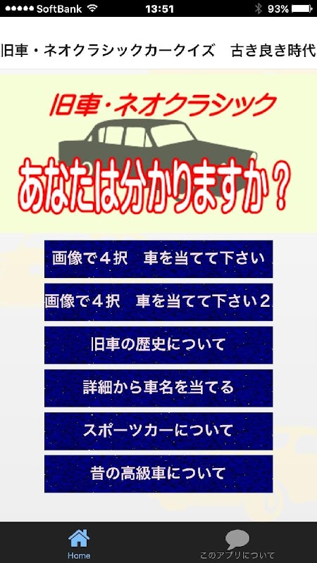 このアプリではクイズ形式で旧車と呼ばれる古い車の事を知る事が出来ます。