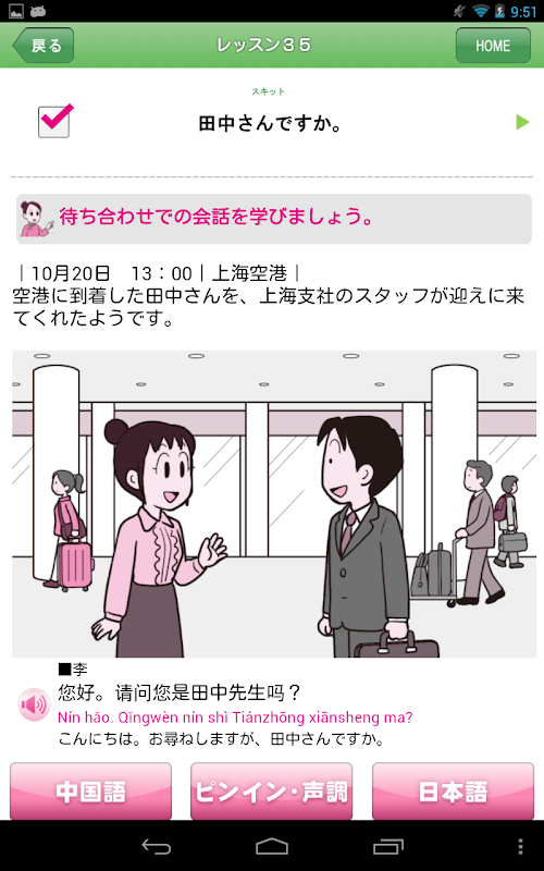 フッターメニューにある「中国語」「ピンイン・声調」「日本語」のボタンをタップすると各レッスンで掲載されている該当要素の表示/非表示が可能。利用者の学習スタイルに合わせて切り替えられるので効率よく学習できます。