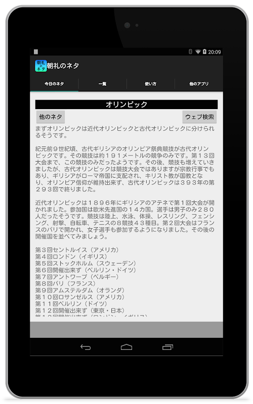 朝礼で何かをスピーチしなければならない。でも話のネタが無い。何でも良いから話のネタをくれ!という人の為のアプリです。起動すれば、ネタが1つ表示されます。
