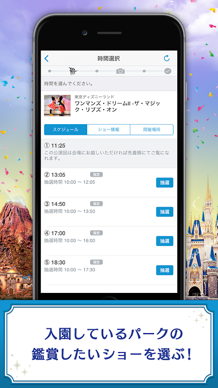 東京ディズニーリゾートで座席指定券が必要なエンターテイメントショーの抽選を、パーク内で、いつでも、どこでも、お好きなタイミングでできるアプリです!