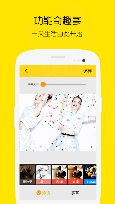 图片效果—你能通过拍照功能轻松拍出具有电影大片感的图片,用电影与字幕的方式记录生活。随时调整字体大小与效果。