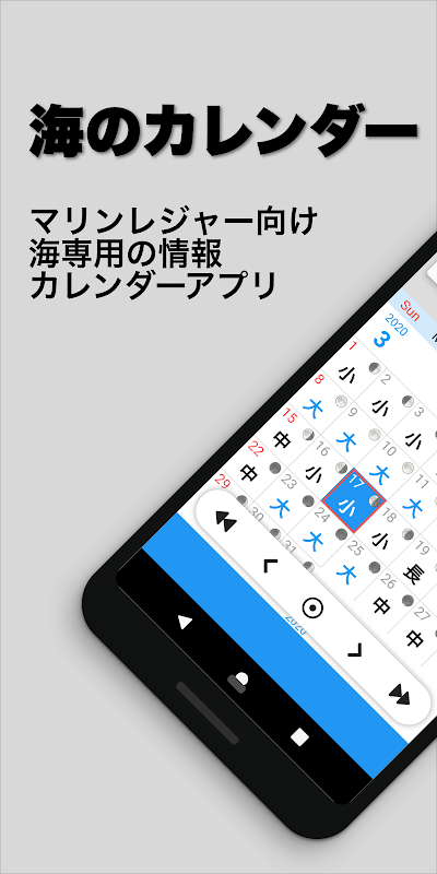 Đây là ứng dụng lịch thông tin dành riêng cho biển dành cho hoạt động giải trí trên biển, chẳng hạn như thủy triều mùa xuân và thủy triều kém, tuần trăng tròn và trăng non cũng như thời gian khuyến nghị để câu cá, nhặt ngao và lướt sóng.