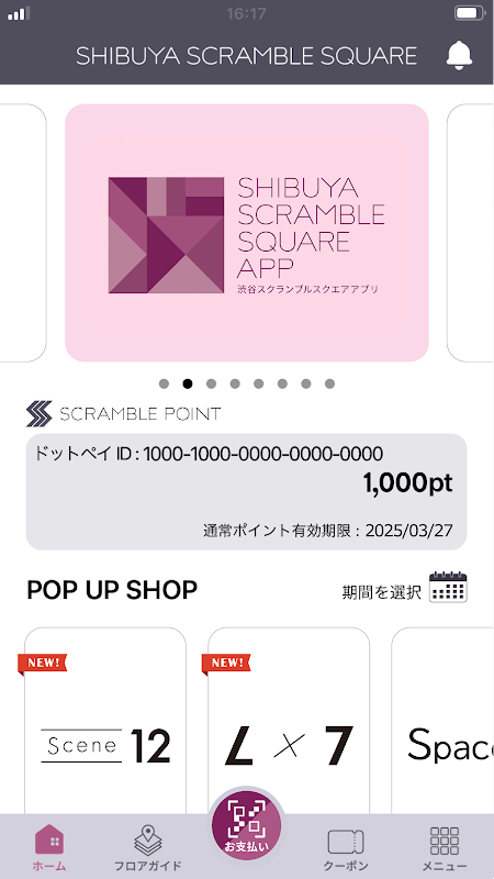 Điểm sẽ được thưởng cho mỗi 100 yên (đã bao gồm thuế) chi tiêu bằng mã QR của ứng dụng tại Quảng trường Scramble Shibuya. [Sản phẩm/Nhà hàng/Cafe 3%/Thực phẩm 1%]