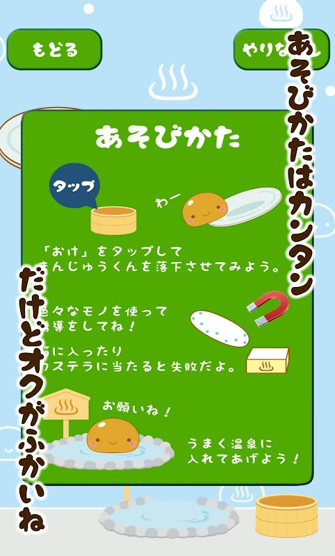 桶をタップして温泉まんじゅうくんを温泉に入れてあげよう