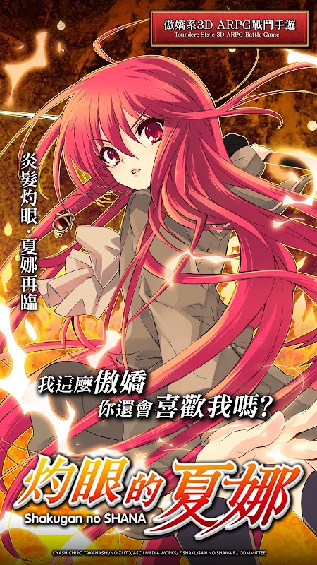 《灼眼的夏娜》,為日本角川集團監製,首款正版授權且忠於原著的3D ARPG戰鬥手機遊戲,輕小說是日本作家高橋彌七郎所撰寫。