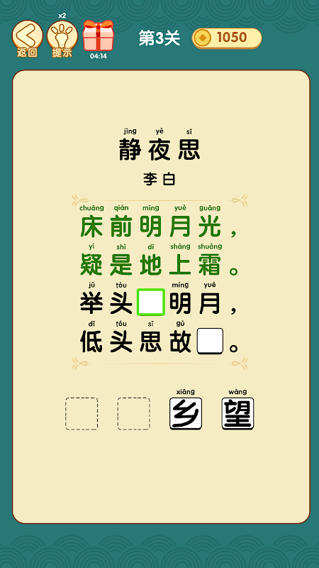 Thơ Đường Trung Quốc chọn lọc, lời bài hát và văn xuôi Trung Quốc cổ đại. Chỉ cần nhấp vào thứ tự các bài thơ để vượt qua cấp độ. Trong game, người chơi có thể trải nghiệm vẻ đẹp của văn học truyền thống, kết hợp trò chơi với thơ cổ Trung Quốc, mang tính giải trí và giáo dục, phù hợp với mọi lứa tuổi. Năm nghìn năm văn hóa được tích hợp ở đây - hàng chục nghìn bài thơ Đường và Tống được chọn lọc, cho phép bạn đánh giá cao vẻ đẹp của thơ ca, cũng như đánh giá cao những bài thơ cổ điển và những câu thoại nổi tiếng, cho phép bạn học hỏi kiến thức khi chơi game.