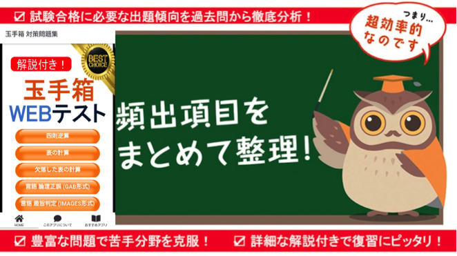 このアプリでは、SPI3と同じく多くの企業採用側にとってに頻出のWEBテスト「玉手箱シリーズ」の問題を、解説付きで多数掲載しています。