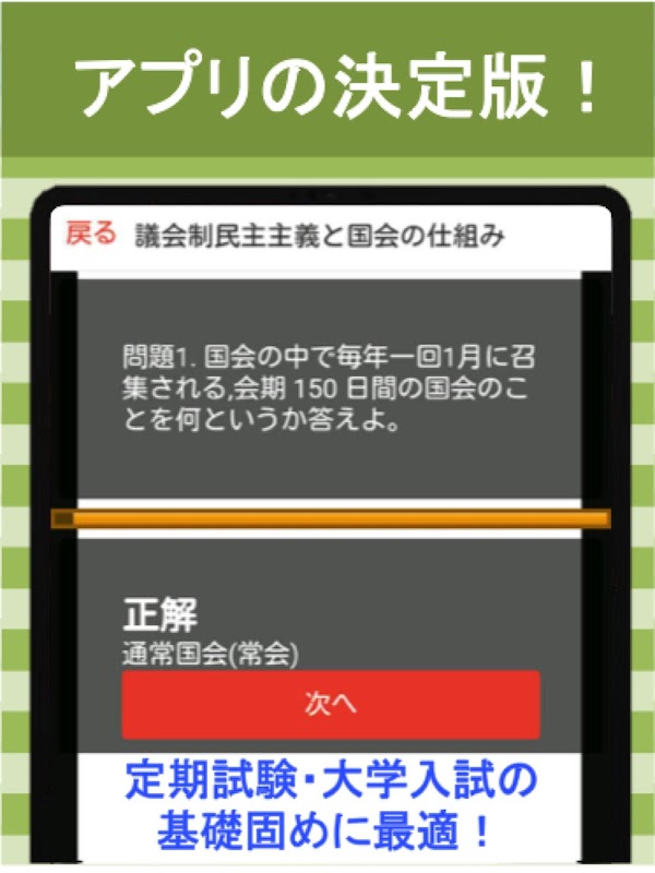 学校の定期テストや大学入試 センター試験ではほぼこのアプリにある知識問題と同じような内容が出題されるはずです。
