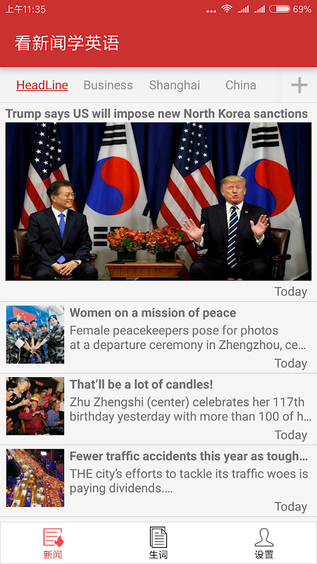 研究表明,每天一篇阅读,坚持3个月,你的英语水平将会有质的提升!但为什么很多人会半途而废?生词!!!英语阅读中的拦路虎! 现在有了看新闻学英语App,你将不会再看到生词而望之却步! 每天精选国内外时事英语新闻,内容丰富,贴近生活,让你更有兴趣和动力每天学习英语。内置英汉词典,即点即查,生词自动发音。生词更可加入自建分类词库,并反复学习,测试,做到真正消灭生词 !