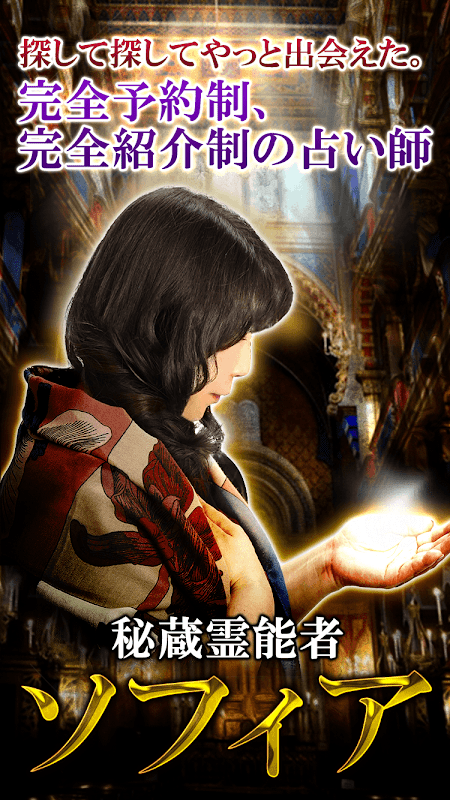 予約殺到のため一見さんお断り。一切顔出しもNGの占い師「ソフィア」。今までコンテンツ化を許されなかった秘密の占い師……交渉に交渉を重ね、やっとやっとアプリになりました。