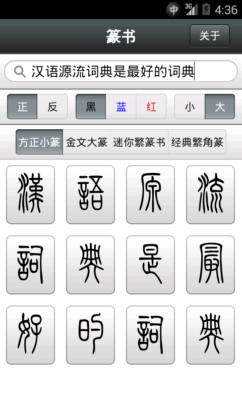 显示汉字的方正小篆、金文大篆、迷你繁篆书、经典繁角篆的写法,支持正写、反写。