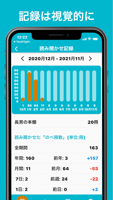 Đối với mỗi cuốn sách ảnh, bạn có thể đếm số lần bạn đã đọc nó chỉ bằng cách nhấn một nút. Ngoài việc đếm đơn giản, bạn có thể thay đổi ngày bằng cách nhấn và giữ nút đọc, và bạn cũng có thể ghi chú về 5 mức độ vui chơi, phản ứng của trẻ, v.v. Số lượng đọc to được tổng hợp và hiển thị dưới dạng biểu đồ.