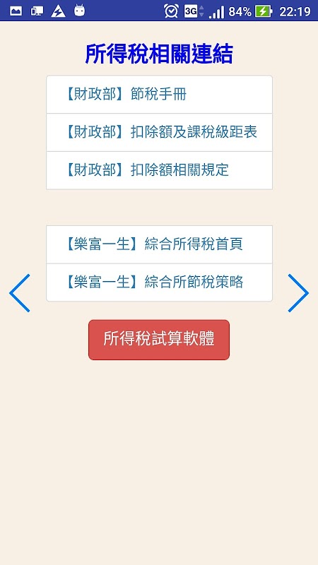 本程式提供綜合所得稅最新稅級及扣除額表,並提供歷年資料作為比較,並有各扣除額報稅注意事項提示,以及所得稅網頁版試算軟體鏈結。若您使用Android 4.0以上的手機,建議安裝手機版試算軟體(https://play.google.com/store/apps/details?id=tw.ewin.taxcalulate)