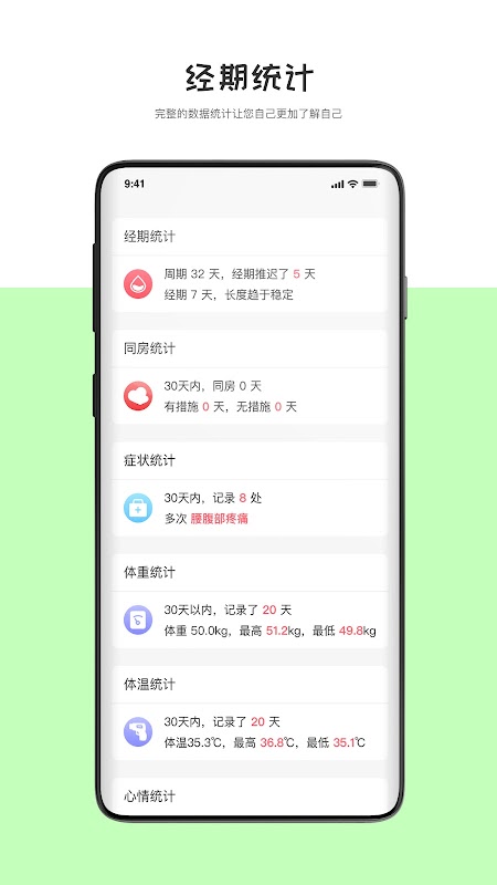 Quản gia sức khỏe cá nhân cho các cô gái, hồ sơ, dự báo, nhắc nhở, mọi thứ đều có sẵn, để bạn tránh bối rối khi quên kinh nguyệt, ghi lại chi tiết tâm trạng và sức khỏe hàng ngày của bạn, giúp bạn hình thành thói quen sinh hoạt tốt và cho bạn biết thể chất của mình điều kiện bất cứ lúc nào.