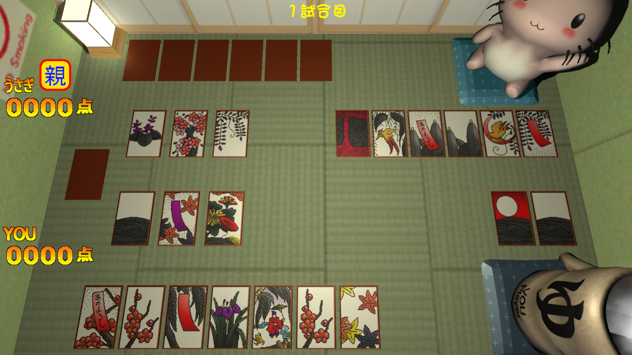 札合わせの花札です。うさぎさんと1対1の勝負です。3回戦か8回戦か選べます。