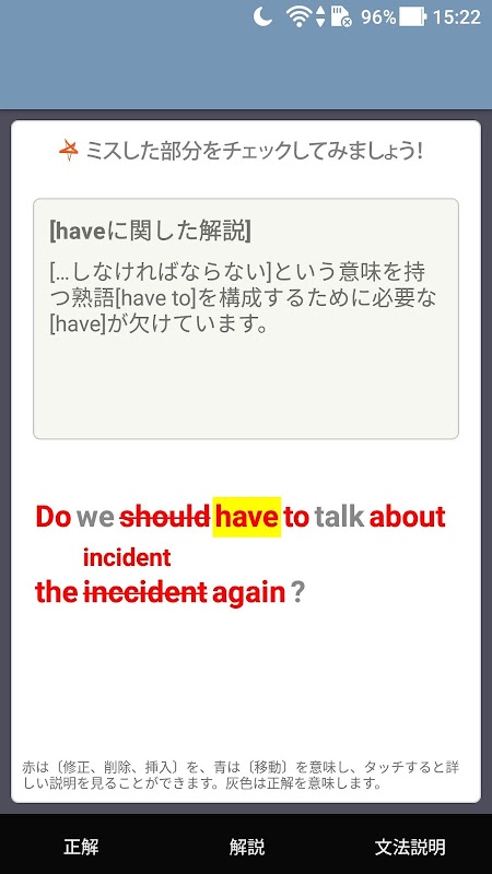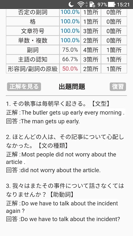 ・ Hiển thị độ chính xác, số lượng mục và số câu trả lời sai cho từng mục ngữ pháp của câu hỏi.