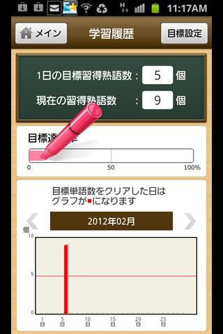 「この日までに1000語習得する!」目標をアプリに登録しておけば、1日の習得英熟語数や現在の習得英熟語数の進捗も確認可能。グラフで目標の進捗を把握でき、やる気もUP!