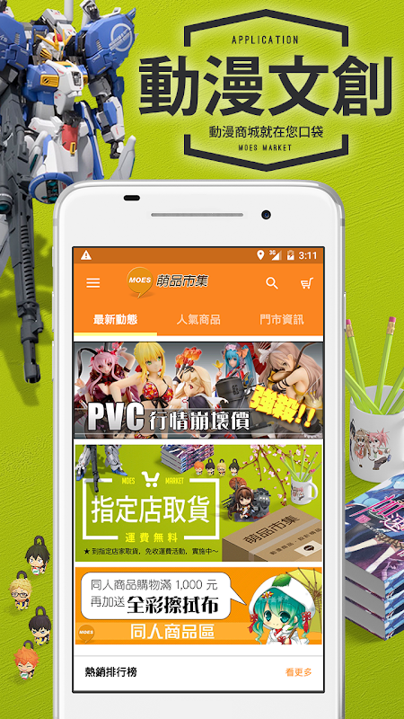 國內外動漫周邊商品與ACG資訊,設計師文創商品的生活行動平台。萌品市集不但橫跨各式平台與行動裝置,更是整合線上的網購宅配便利、線下實體店家銷售服務的安心。