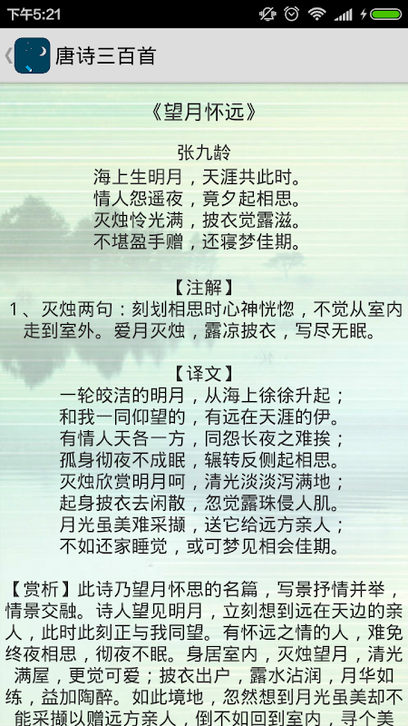 詩詞助手提供了唐詩三百首,宋詞三百首的正文/註釋/翻譯/賞析,讓妳盡情欣賞中華文化的博大精深。更多詩詞集,包括詩經,楚辭,漢賦等,陸續添加中。
