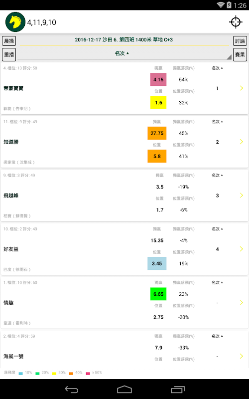 -馬匹資料顯示:透過落飛燈及排序及圖表等方式多角度展示