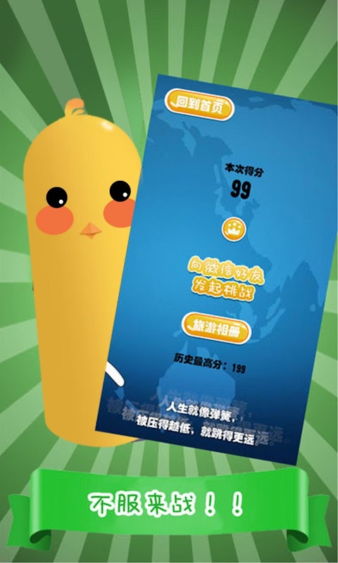 在你闲暇的时间里给你带来快乐!游戏中你点击的时间越长,跳跃得就越远!看准时机松开手指,获得完美评分!真是乘公交,挤地铁,旅游出行途中打发时间的必备神器呢!