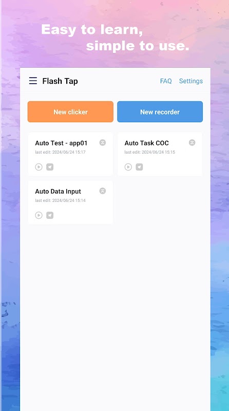 Tải xuống Flash Tap ngay hôm nay và cách mạng hóa cách bạn tương tác với thiết bị Android của mình. Tự động hóa các tác vụ, tiết kiệm thời gian và nâng cao năng suất của bạn một cách dễ dàng bằng cách sử dụng ứng dụng nhấp chuột tự động tối ưu hiện có! 🚀📲