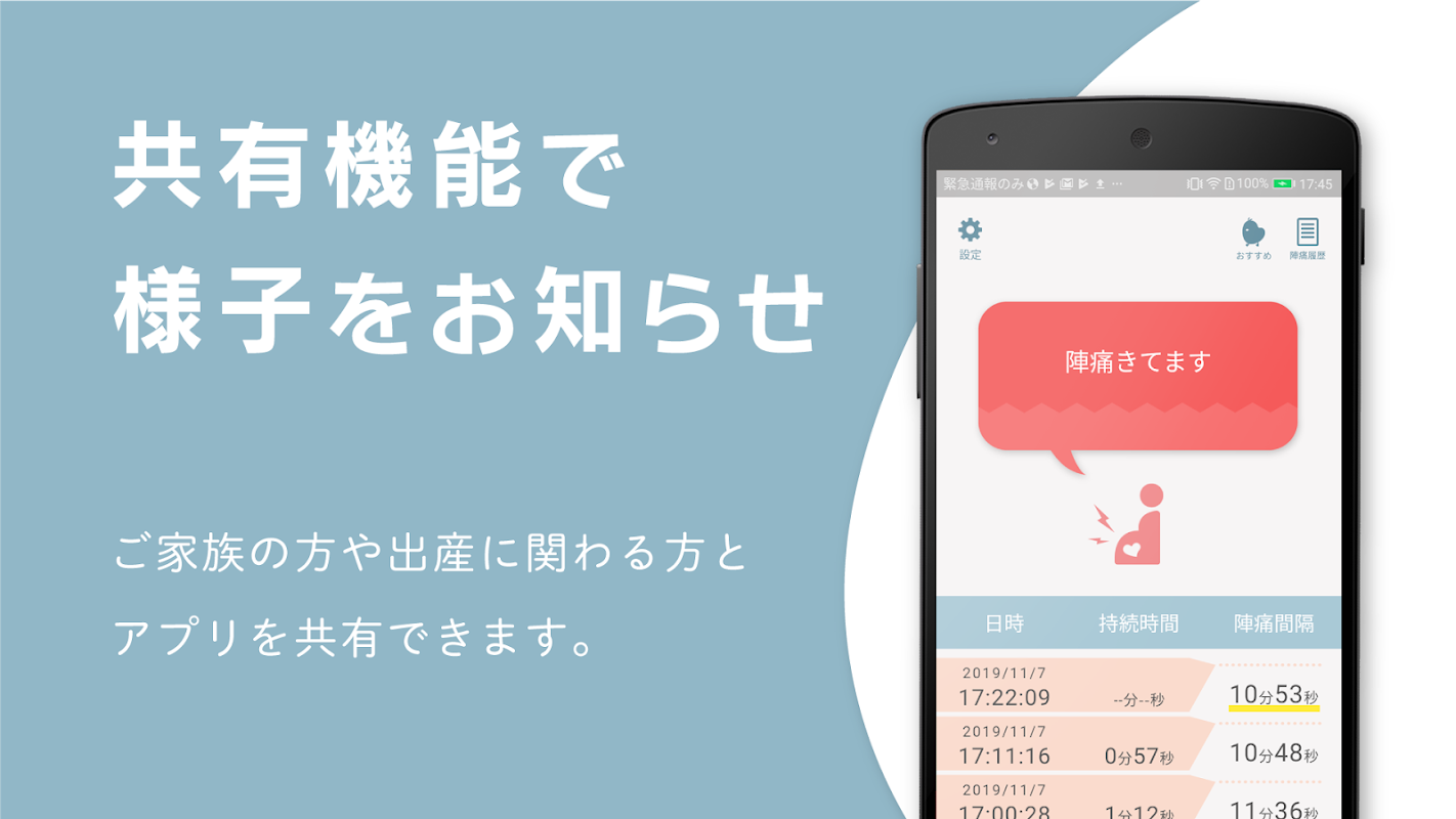 これからママ・パパになる方、家族の方たちとアプリを共有して、産まれてくる赤ちゃんのために出産準備を進めていきましょう。病院に行ったらアプリの陣痛履歴を表示して見せればOK!