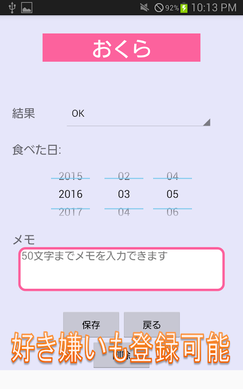 1.0.2 Android5.0以上で、食べた日付の指定ができない不具合修正。