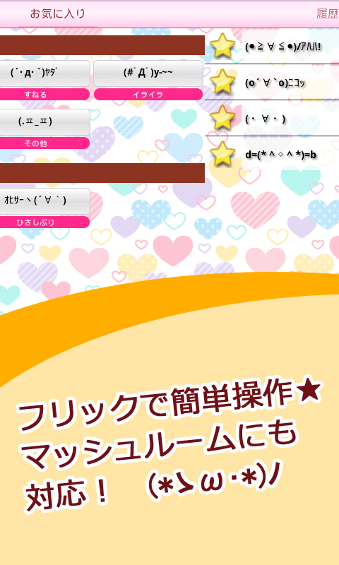 かわいい顔文字が簡単に入力できる!便利な機能がいろいろあるよ ・オリジナルの顔文字が登録可能 ・いらない顔文字は削除できる ・特殊文字フィルター機能
