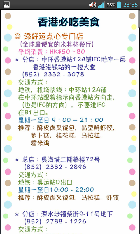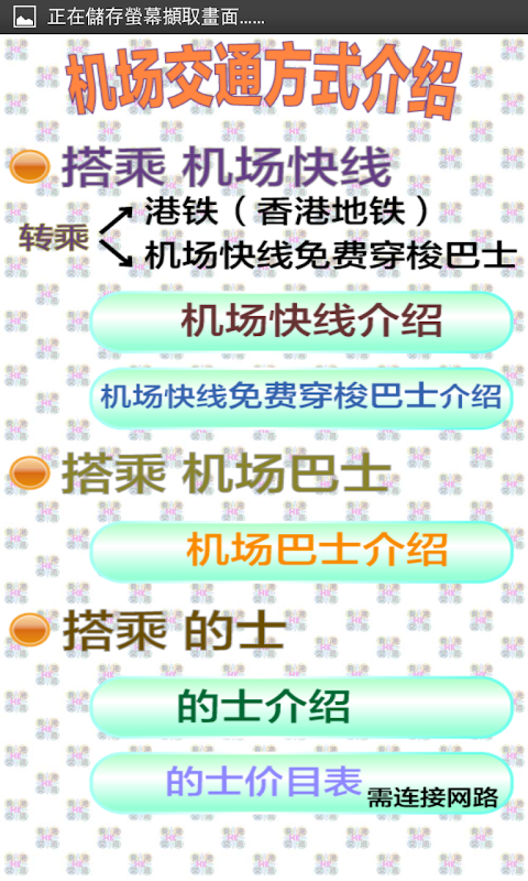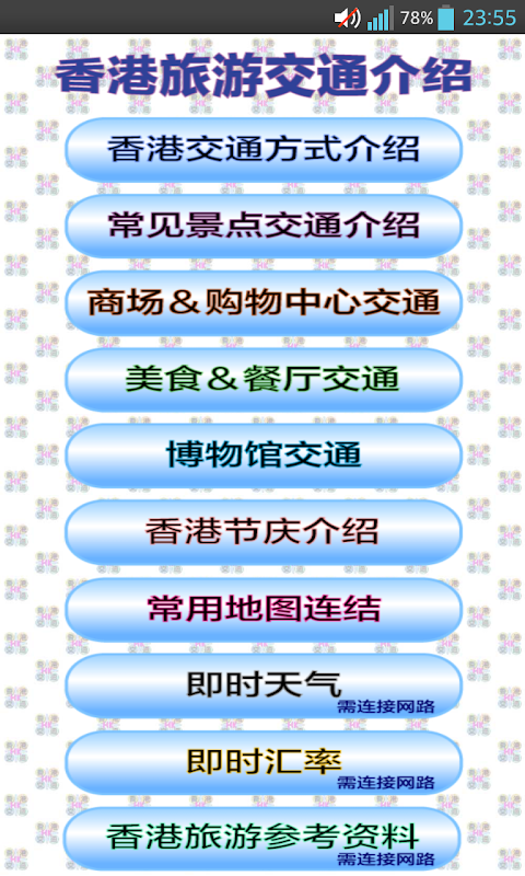 地图与介绍等资讯可以离线流览,但是天气、汇率和香港交通资讯的相关网站,因为要获取即时资料,所以需要连接网路才能查询,有提供可查询景点交通的网站!