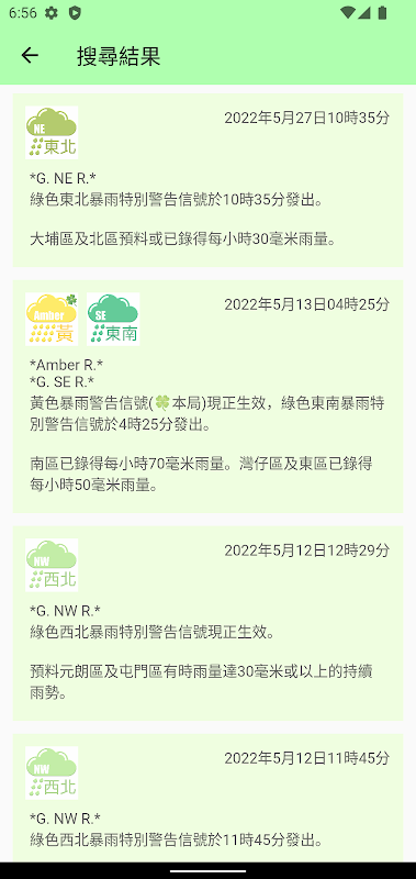 ‧Bão cấp huyện: tín hiệu cảnh báo mưa đặc biệt theo hướng đông bắc / đông nam / tây nam / tây bắc màu xanh lục