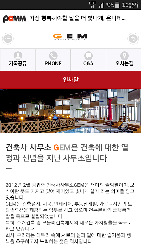 건축사사무소 GEM은 끊임없는 기술개발과 철저한 서비스로 한국 건축문화가 새로운 성장과 발전을 이룩하는데 최선을 다하겠습니다.