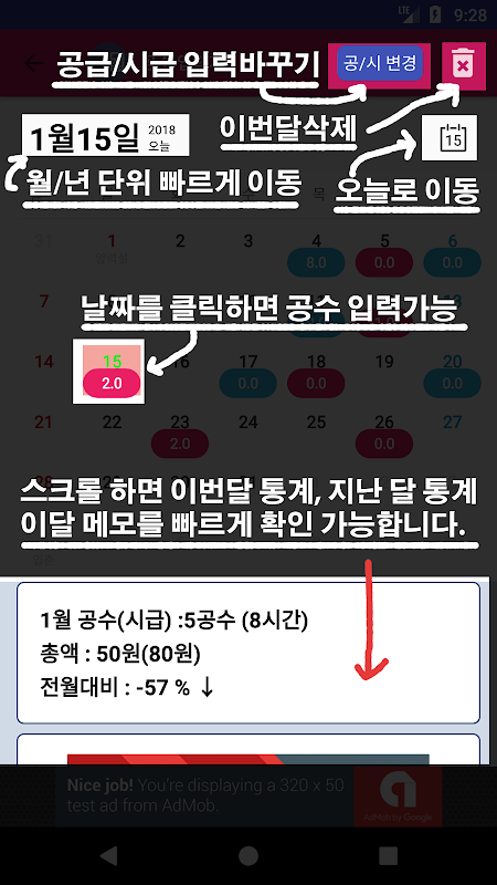 공수와 시급을 달력에 기입하여 자동으로 계산해 주는 앱입니다.
