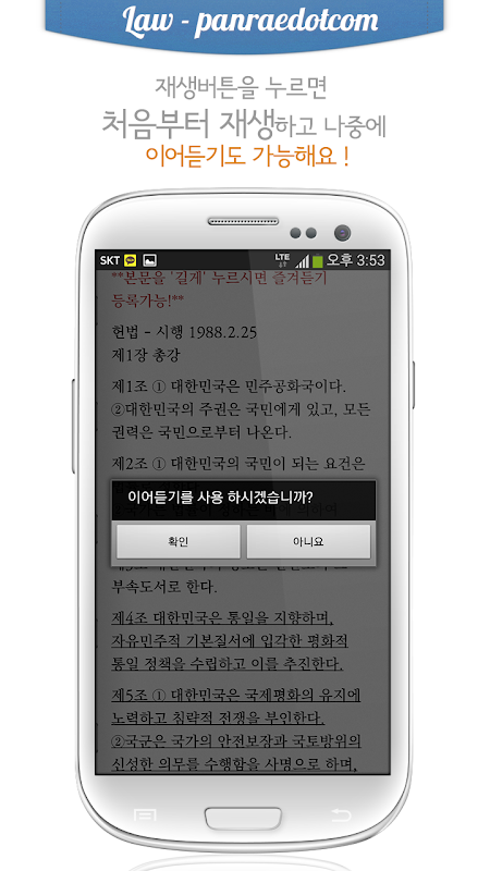 - 판례듣기 앱은 최초 실행시에 온갖 종류의 재생오류를 원천적으로 잡기위해 실행시 파일존재여부를 하나하나 파악한 후에 진입하도록 설계되었습니다. 따라서 최초진입시에만 통신을 사용하며, 이후 재생시에는 별도의 통신을 사용하지 않습니다.