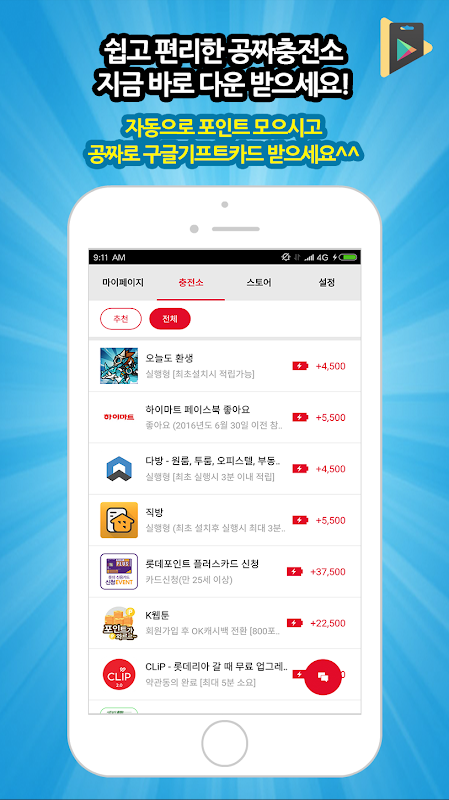 자동으로 포인트가 쌓이면 [스토어] 메뉴를 이용하여 플레이스토어에 등록된 각종 모바일 게임을 유료 결제하실 수 있답니다~ 물론 무료로^^