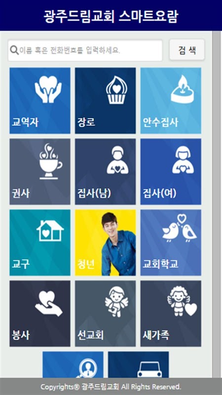 교역자, 장로, 권사, 집사 및 구역장(목자), 교사 등 모든 성도들의 요람을 스마트폰에서 확인하실 수 있는 스마트폰용 어플리케이션입니다.