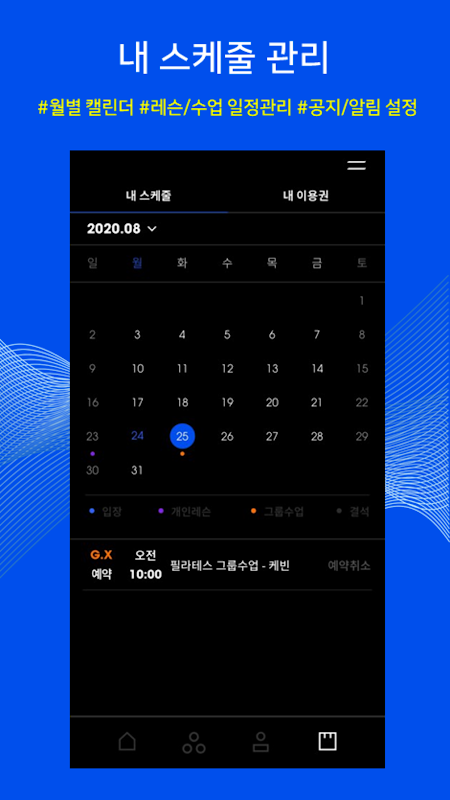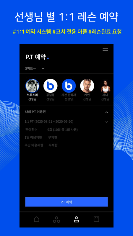 바디코디 가맹점을 이용하는 고객들은 별도로 수업시간을 선생님과 조율할 필요없이 스마트폰에서 언제든지 이용할 시간을 미리 예약할 수 있습니다.