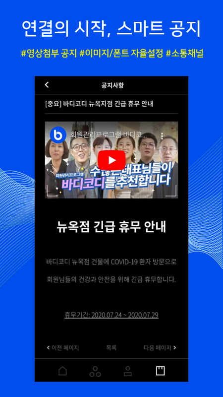 언제 어디서나 스마트폰에서 원하는 시간에 수업을 간편하게 예약하는 바디코디 어플리케이션! 현재 이용 중인 가맹센터의 수업과 서비스를 지금부터 미리 스케줄과 일정을 예약하시기 바랍니다.