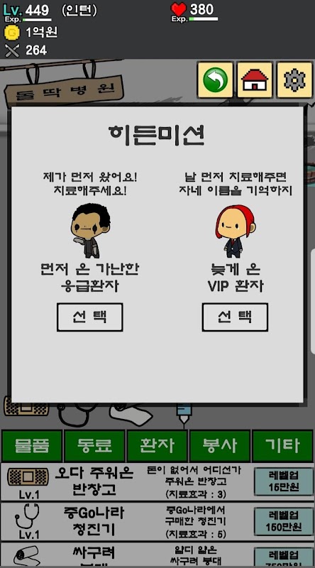 - 다양한 의료물품을 구비하여 환자를 적절히 치료해주세요.