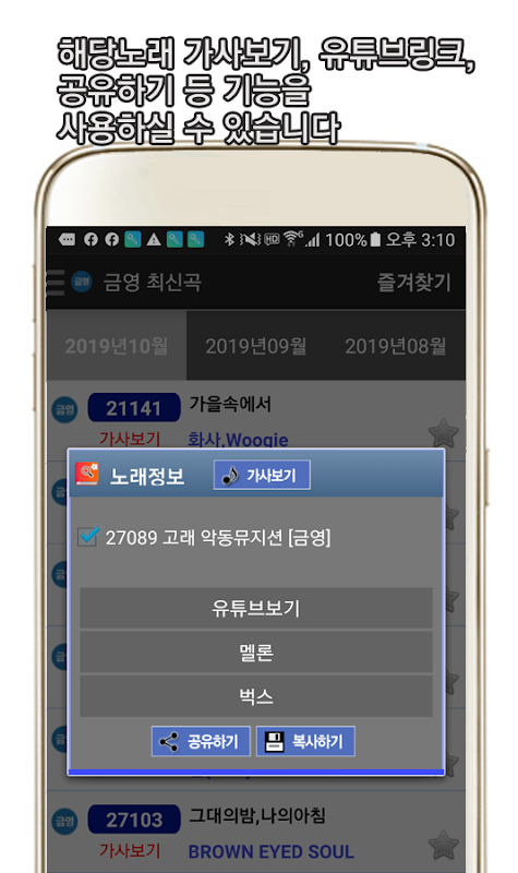 검색한 노래정보는 카톡보내기, 공유하기, 복사 기능 등 SNS로 자료를 공유할 수 있고,