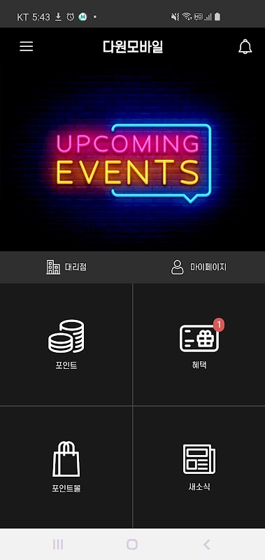 1) 메인 화면: 우리 대리점에서 진행하는 이벤트와 고객님께서 보유중인 헤택, 그리고 알람 메시지를 한 눈에 확인할 수 있습니다.