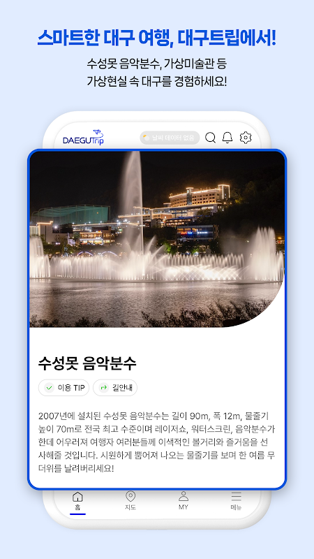 Trải nghiệm Daegu trong thực tế ảo với các tính năng trải nghiệm du lịch thông minh như Đài phun nước âm nhạc Suseongmot và Bảo tàng nghệ thuật ảo.